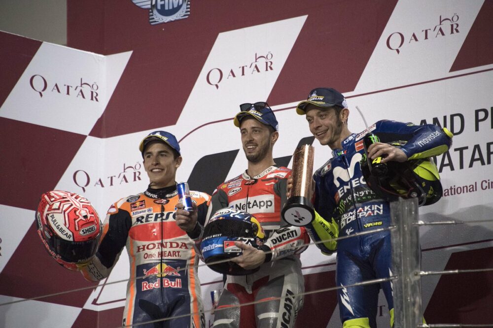 Começou no Qatar o mundial de MotoGP e, como se esperava, o espetáculo foi excelente, tanto na luta pela vitória entre Dovizioso (Ducati) e Marquez (Honda), como nas posições subsequentes, onde luziu o veterano Rossi (Yamaha) que completou o pódio. Aliás o fato do primeiro pódio do ano apresentar três marcas diferentes – Ducati, Honda e Yamaha – diz bem quanto este mundial deverá ser apaixonante.