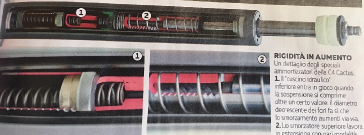 Rodando com o Cactus destaca-se o conforto em todas as condições normais de solo, determinado pela adoção de amortecedores hidráulicos progressivos (são nada menos que 20 brevês) que se adaptam a cada instante às condições do piso. Substituindo os tradicionais tampões de fim de curso com uma peça encarregada de amortecer hidraulicamente as solicitações recebidas, foi possível utilizar uma regulagem básica macia, que atua perfeitamente em caso de irregularidades leves. Quando estas aumentam, entram em ação dois atenuadores que aumentam progressivamente a frenagem da compressão e da extensão. Isto é obtido com uma série de furos de tamanho decrescente no percurso do óleo do amortecedor, coisa que torna muito agradável (e confortável) dirigir este Cactus.