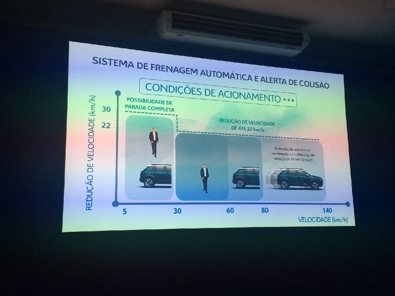 Com relação à segurança ativa , o carro tem um sistema de frenagem automática ao se deparar com um obstáculo a 30 km/h e acima dessa velocidade, ele se responsabiliza por diminuir gradativamente a velocidade, mas necessita da intervenção do motorista para a a frenagem total.