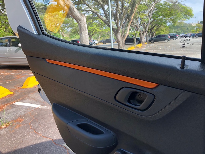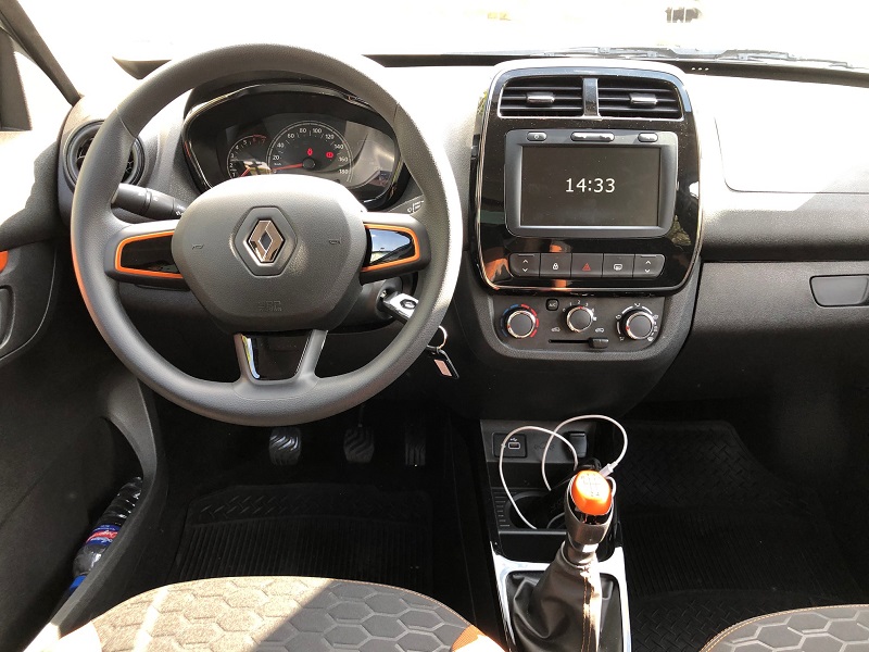 No interior, o Kwid recebeu bancos com detalhes de tecido na cor laranja e costura na mesma cor, além do câmbio com o topo também laranja.