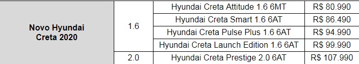 “O Creta acumula 115 mil unidades vendidas no País desde seu lançamento, tendo encerrado 2018 como o líder dos SUVs compactos. Tudo no Creta foi projetado para proporcionar conforto, prazer e segurança aos ocupantes, além de maior espaço interno e de porta-malas. A linha 2020 chega para renovar os padrões de modernidade. Em suas diferentes versões, o modelo reúne o que há de mais completo para cada faixa de preço”, comenta Angel Martinez, vice-presidente de Vendas, Pós-vendas, Marketing, Relações Públicas e Logística de Veículos da Hyundai Motor Brasil.